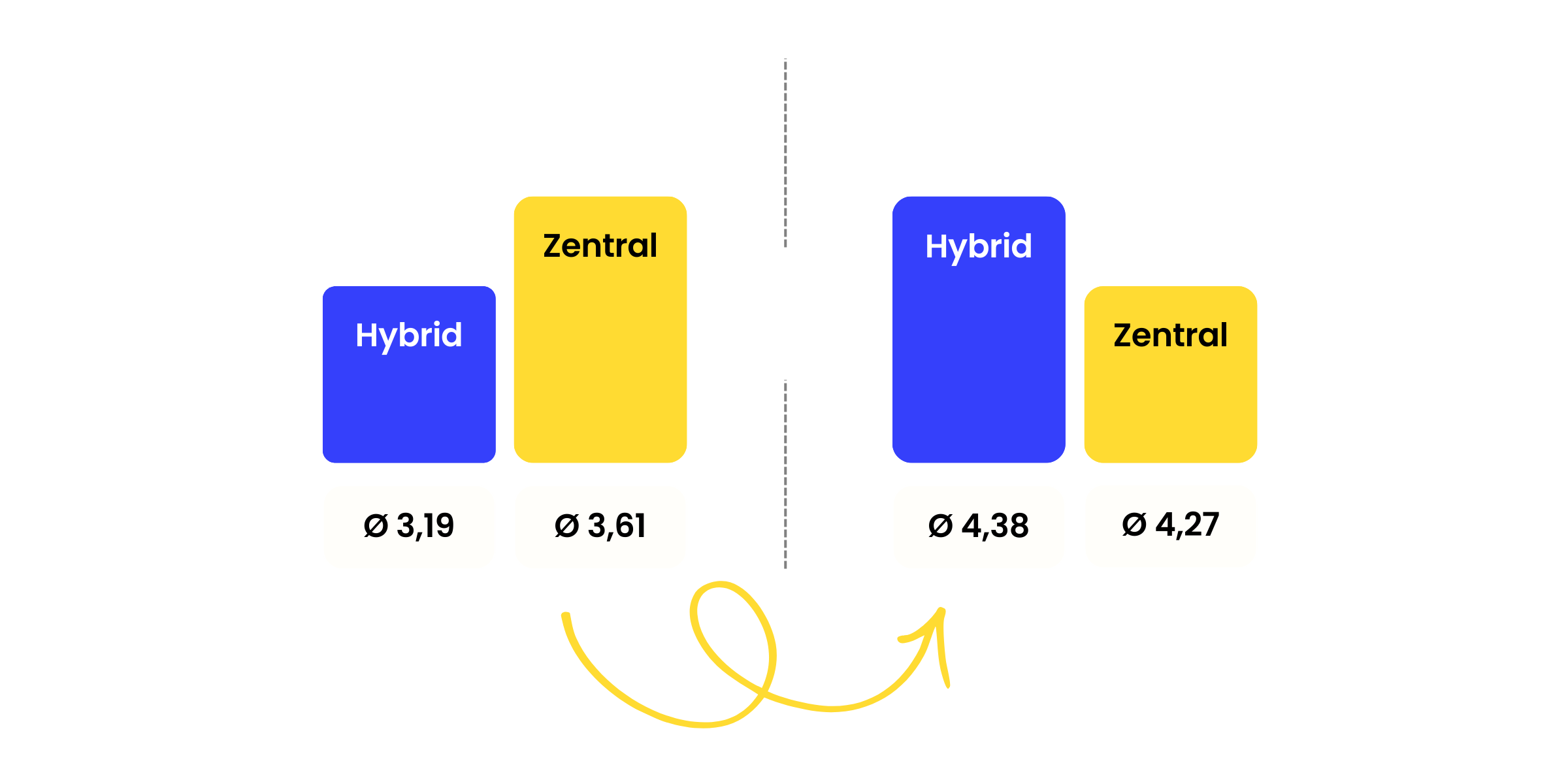 96,3 % der hybriden Unternehmen bewerten ihre datengestützte Entscheidungsfindung mit Top-2-Werten (Skala 1–5), verglichen mit 80,6 % der zentral gesteuerten. Ein Unterschied von 15,7 Prozentpunkten laut Strix Benchmark 2026.