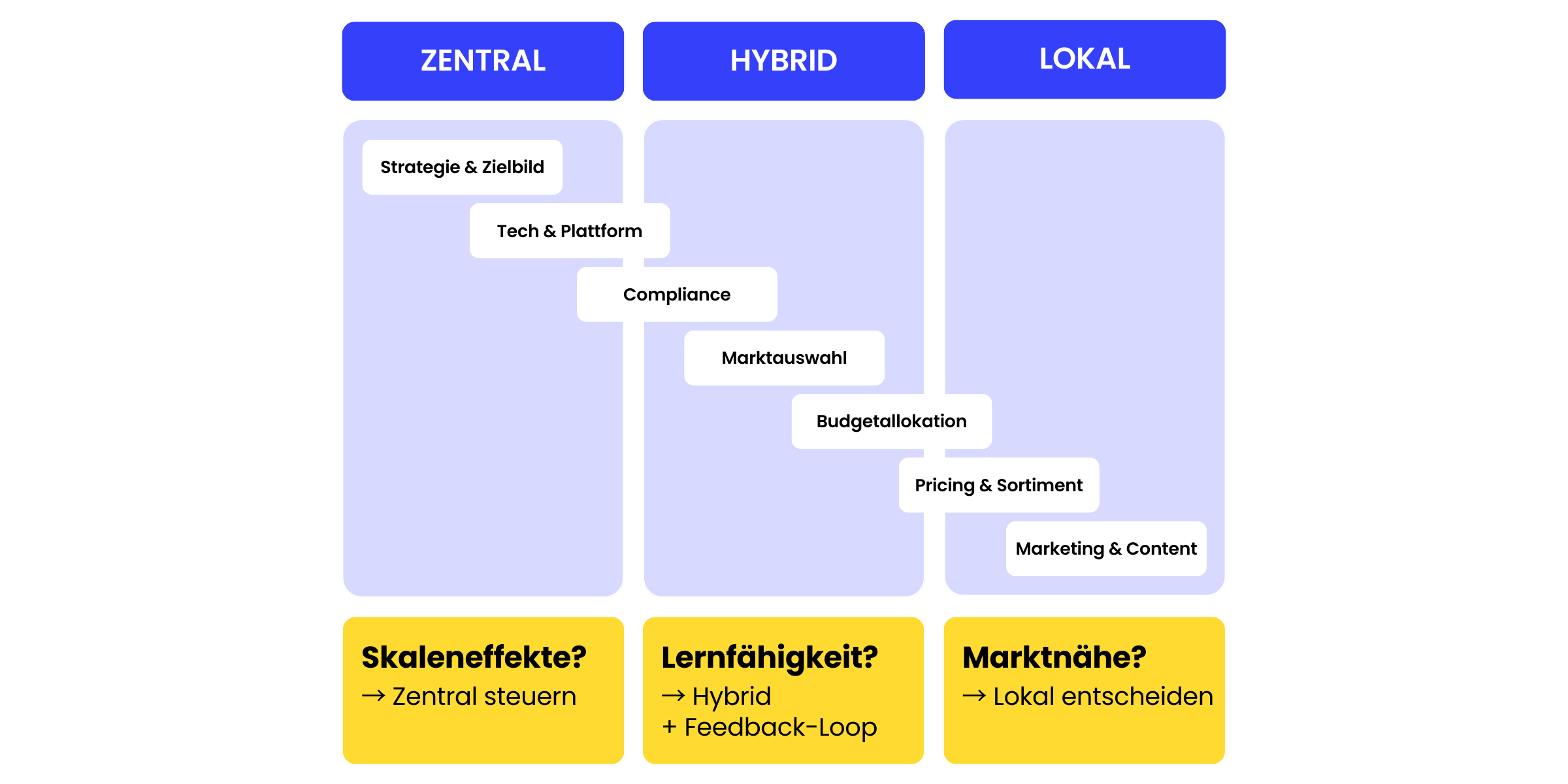 2. Marktnähe: Erfordert diese Entscheidung lokales Wissen? (z. B. Pricing, Content-Tonalität, Zahlarten) → Lokal.