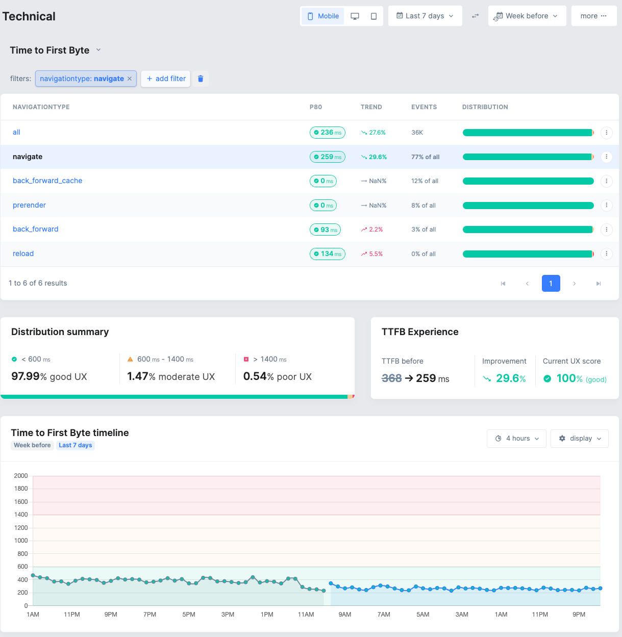 - Gemiddelde TTFB: Verlaagd van 368ms naar een indrukwekkende 259ms (P80).